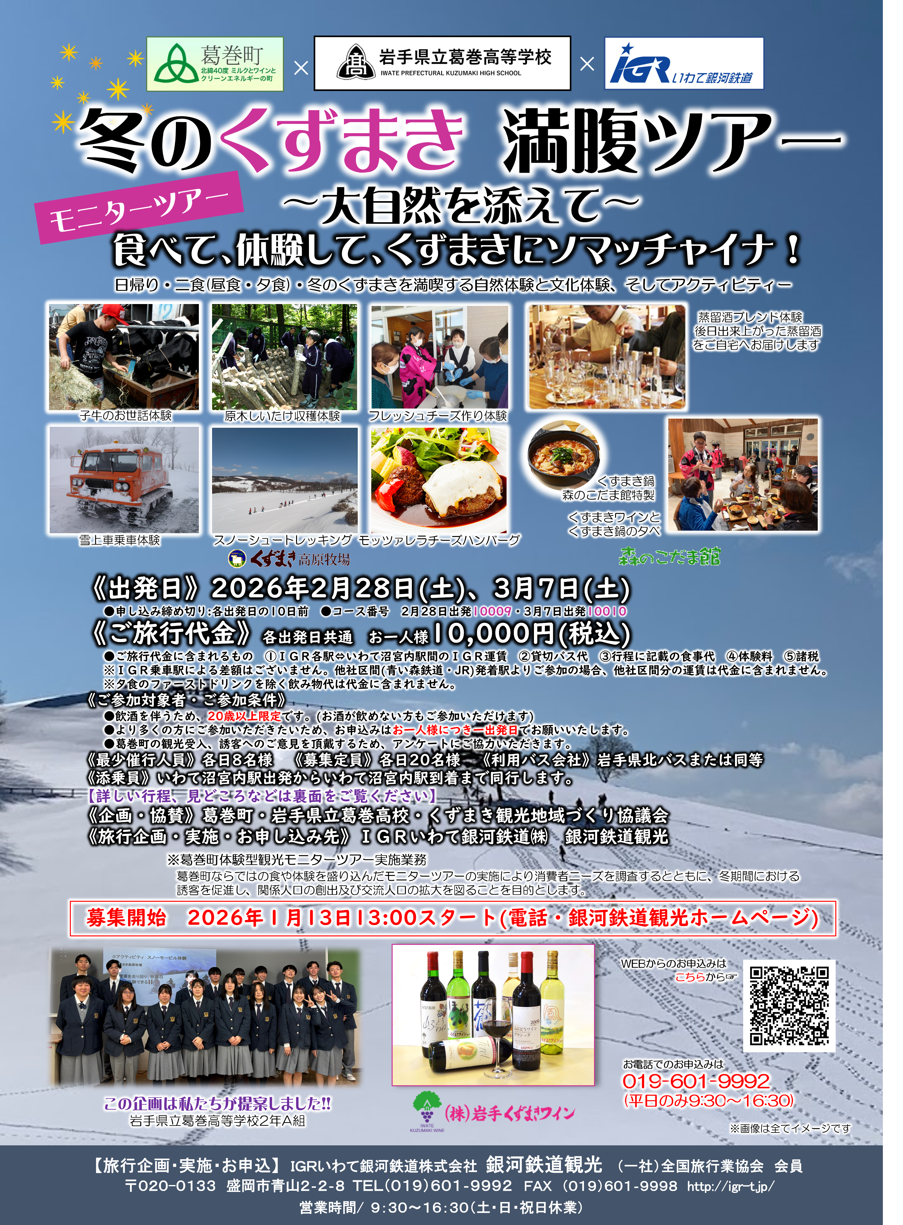 【募集中!!】日帰りモニターツアー「冬のくずまき 満腹ツアー~大自然を添えて~」2026