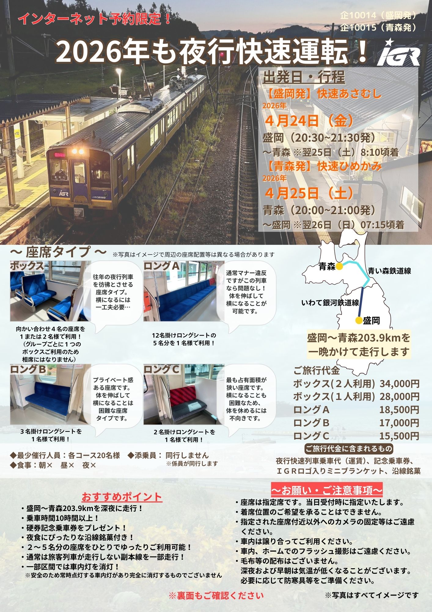 臨時夜行快速あさむし 2026年4月24日(金) ボックスシート(2名利用)1グループ: 34,000円 ボックスシート(1名利用) おひとり様:28,000円 ロングシートA おひとり様:18,500円 ロングシートB おひとり様:17,000円 ロングシートC おひとり様:15,500円 (旅行代金に含まれるもの) ・夜行快速乗車運賃 ・記念乗車券 ・IGRロゴ入りミニブランケット ・沿線銘菓 集合場所 IGR盛岡駅改札前 ※集合時間については最終のご案内文書にてお知らせいたします。 募集人数 28名様 ・青森~盛岡のおよそ203.9kmを深夜に走行! ※時間調整のため一部の駅では長時間停車することがあります。 ・硬券記念乗車券をプレゼント ・IGRロゴ入りミニブランケットをプレゼント ・通常は旅客列車が走行しない副本線を一部走行